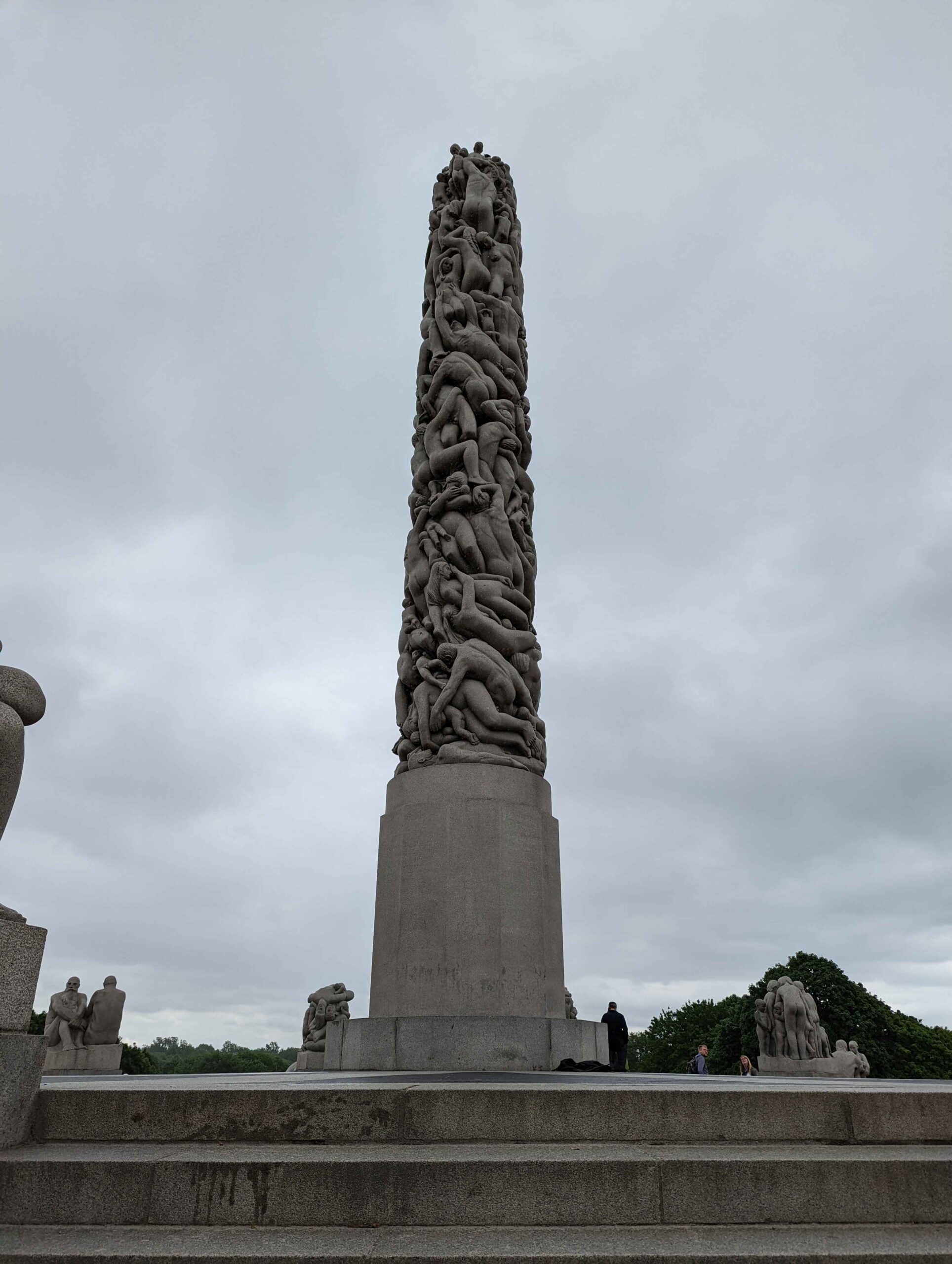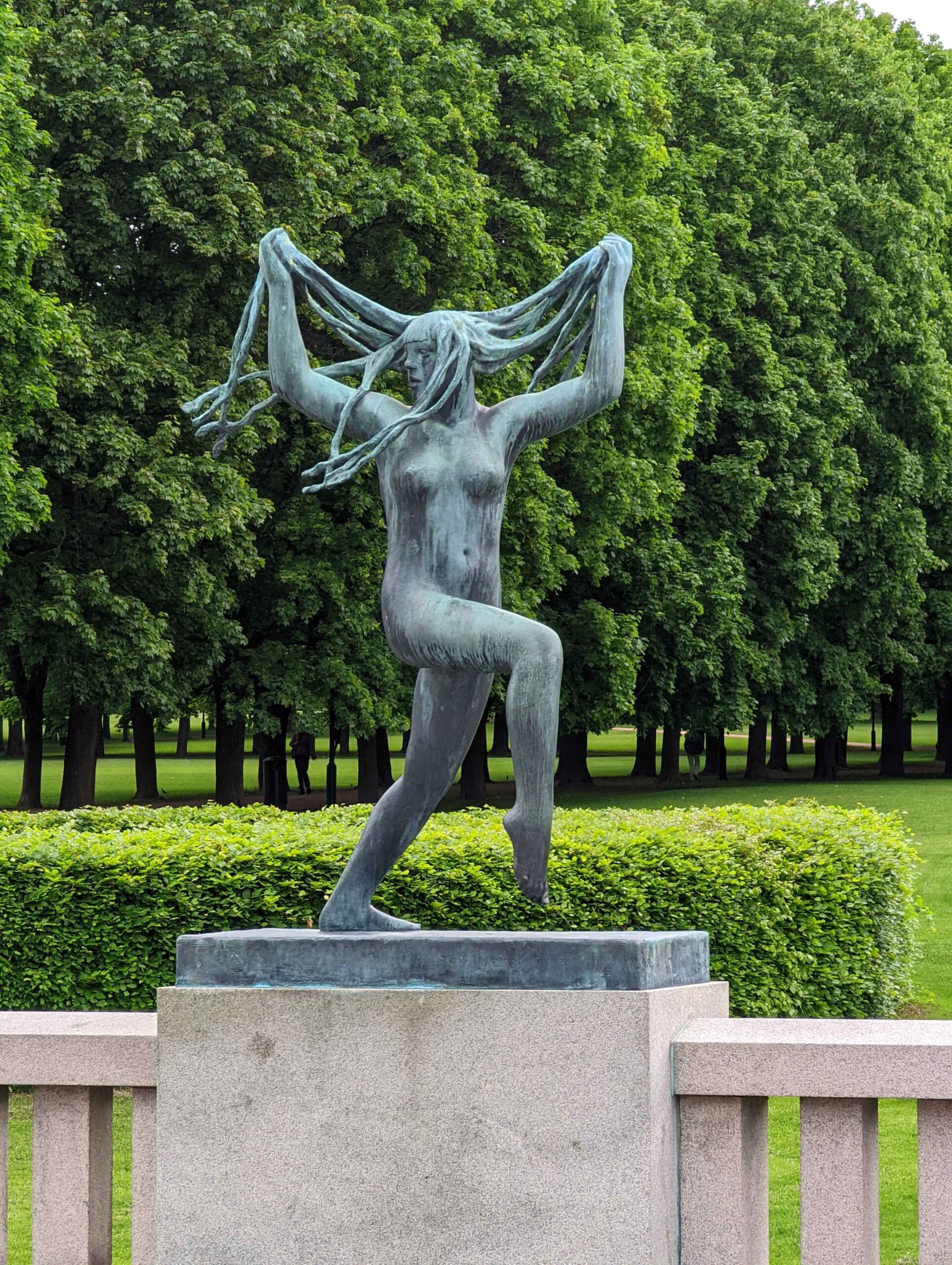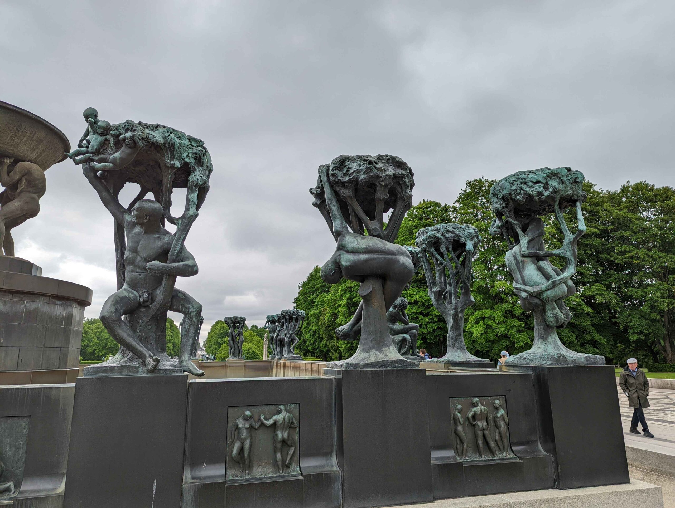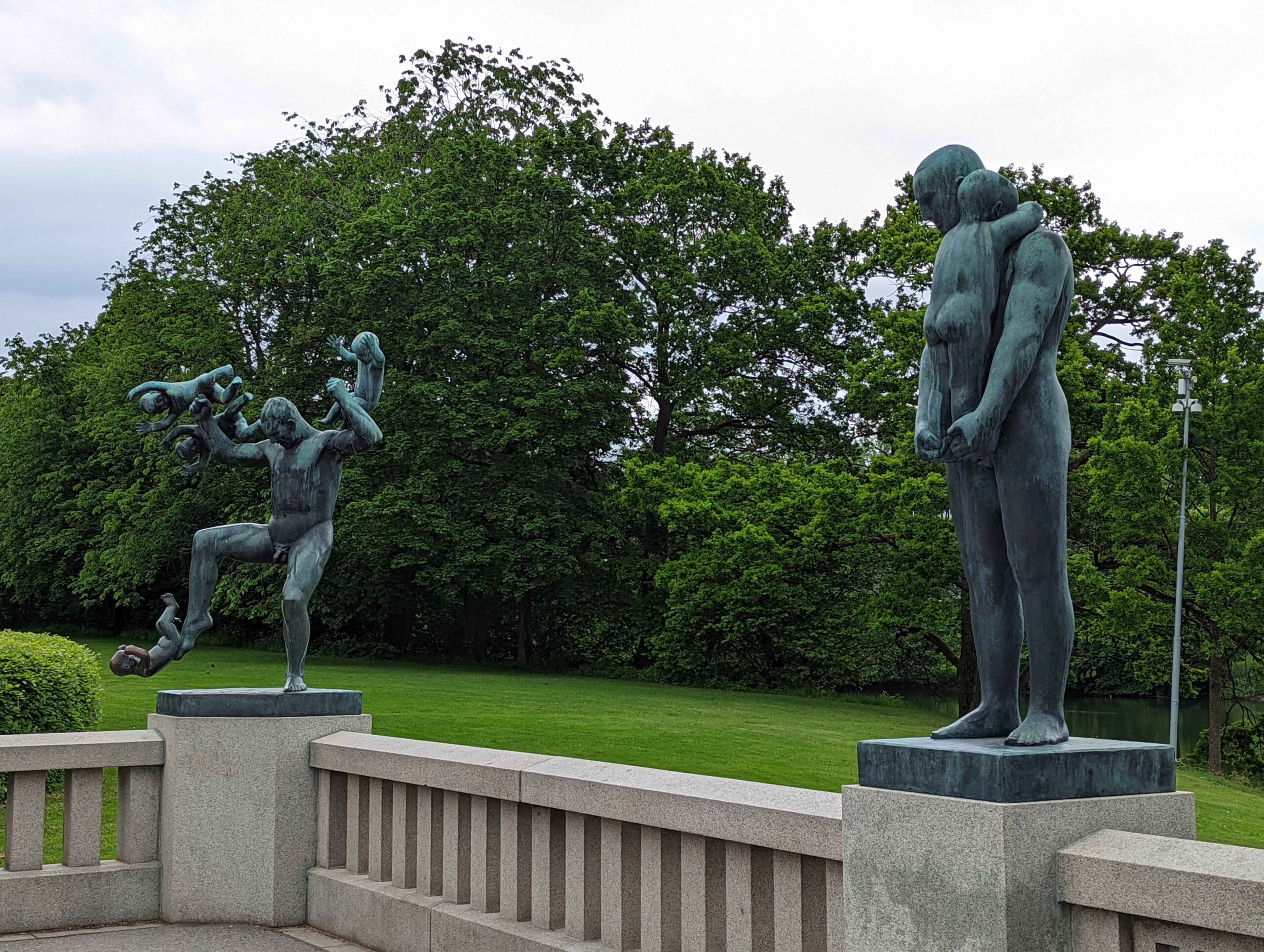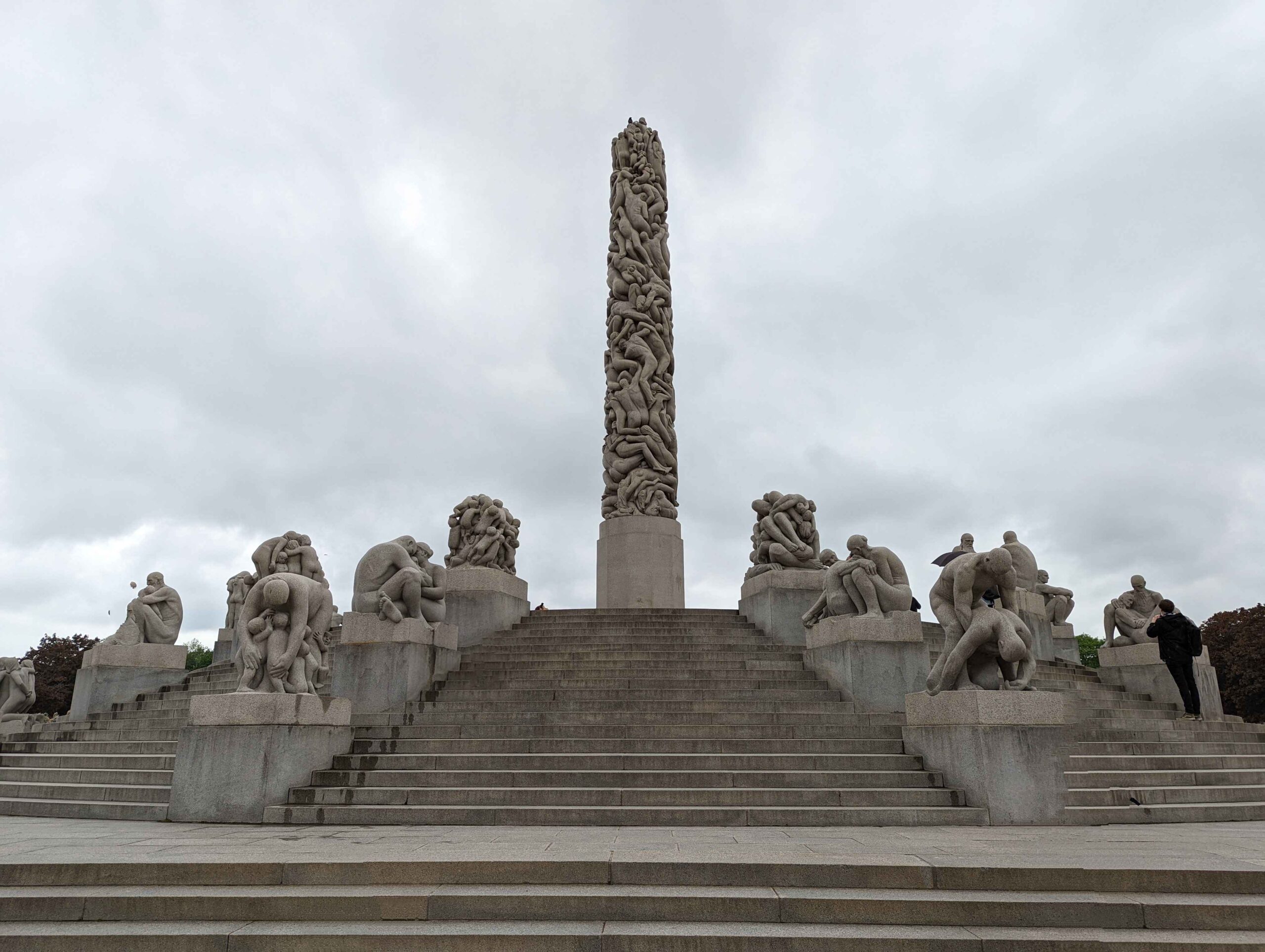 The excursion continued to Frognerparken and Vigelandsparken, where Gustav Vigeland’s sculptures fill the parks with dramatic scenes of human emotion. Walking along the tree-lined paths felt like wandering through a giant outdoor gallery. Statues depict families struggling, joy, and movement in striking detail. From there, we visited Holmenkollen Ski Museum for panoramic views over Oslo and the fjord. The museum itself was closed during my visit, so the ski jump ramp was inaccessible, but the view from the area was still spectacular.